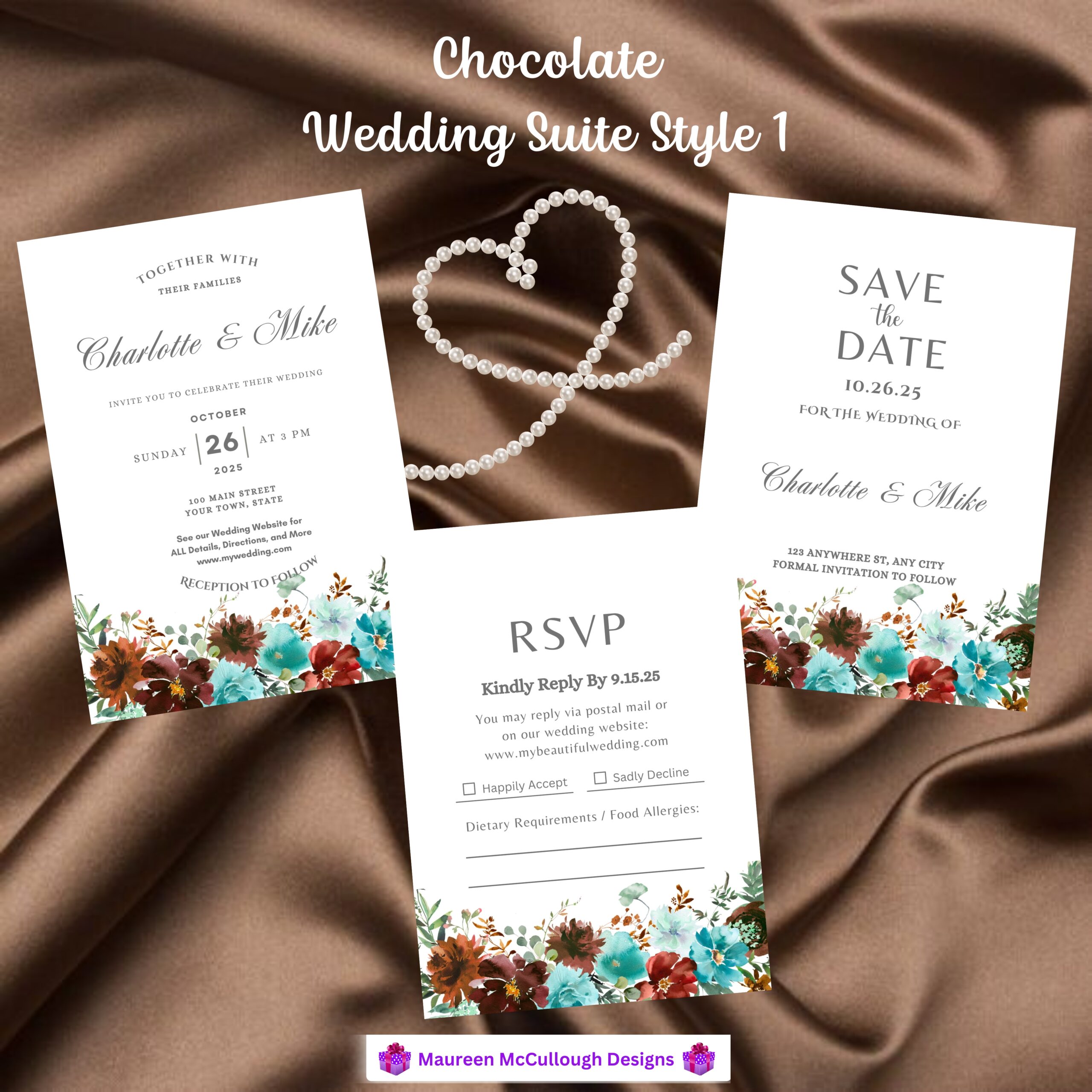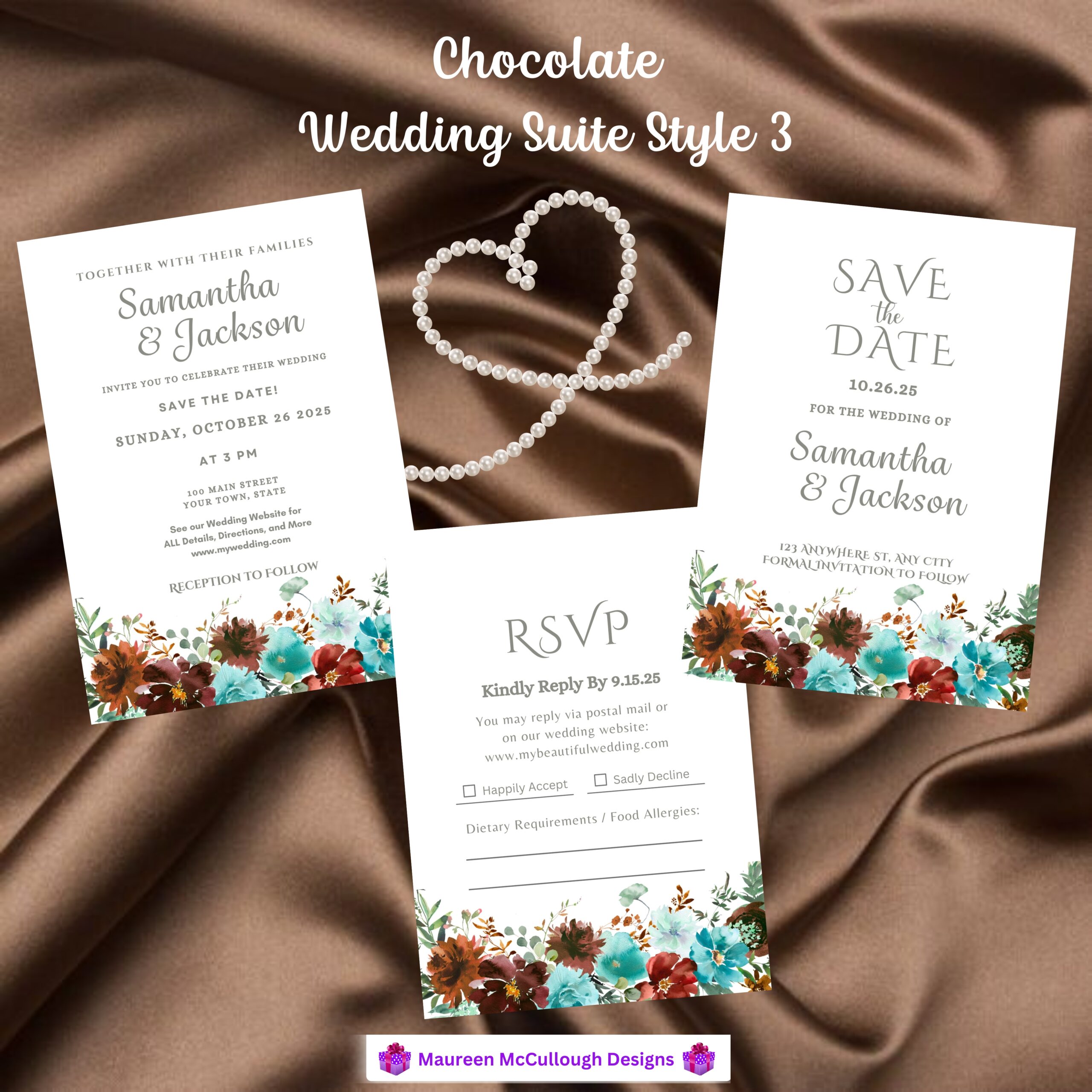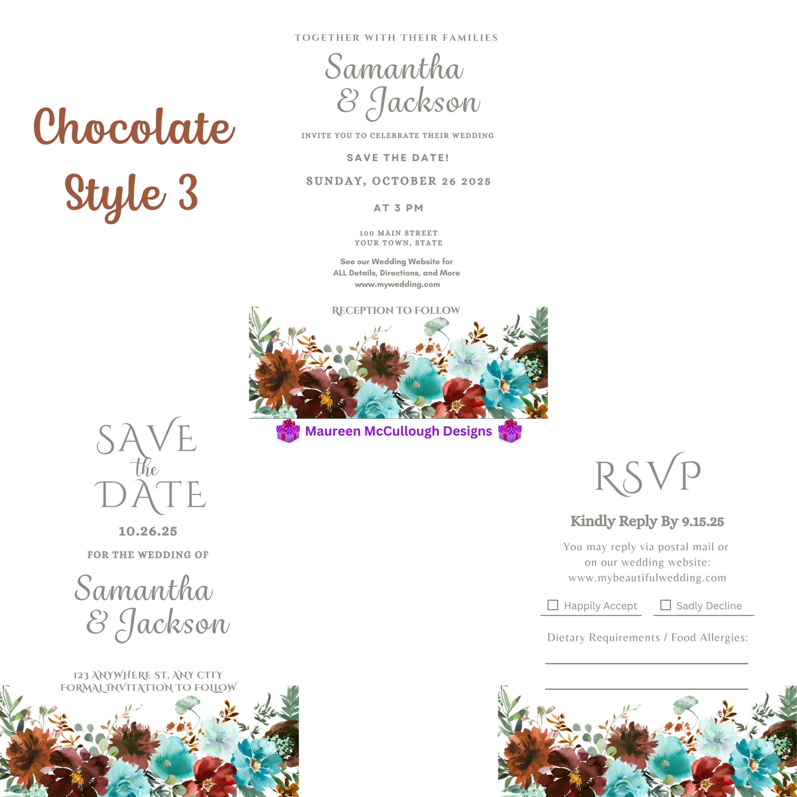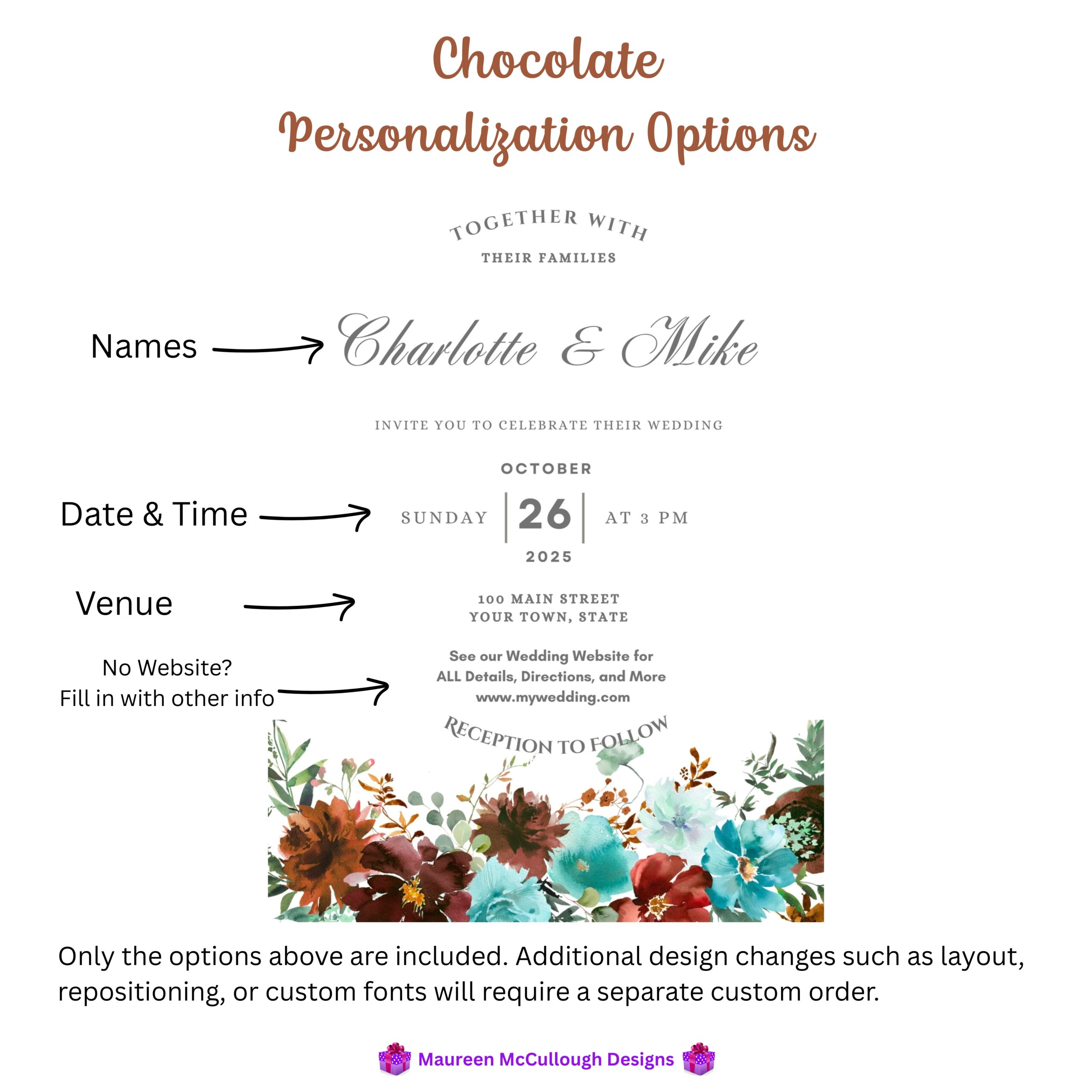 The artwork blends chocolate brown florals with burnt orange accents, turquoise blooms, and soft greenery — a distinctive fall palette that feels both cozy and refined. Three signature script styles are available, allowing you to choose the look that best complements your wedding aesthetic.