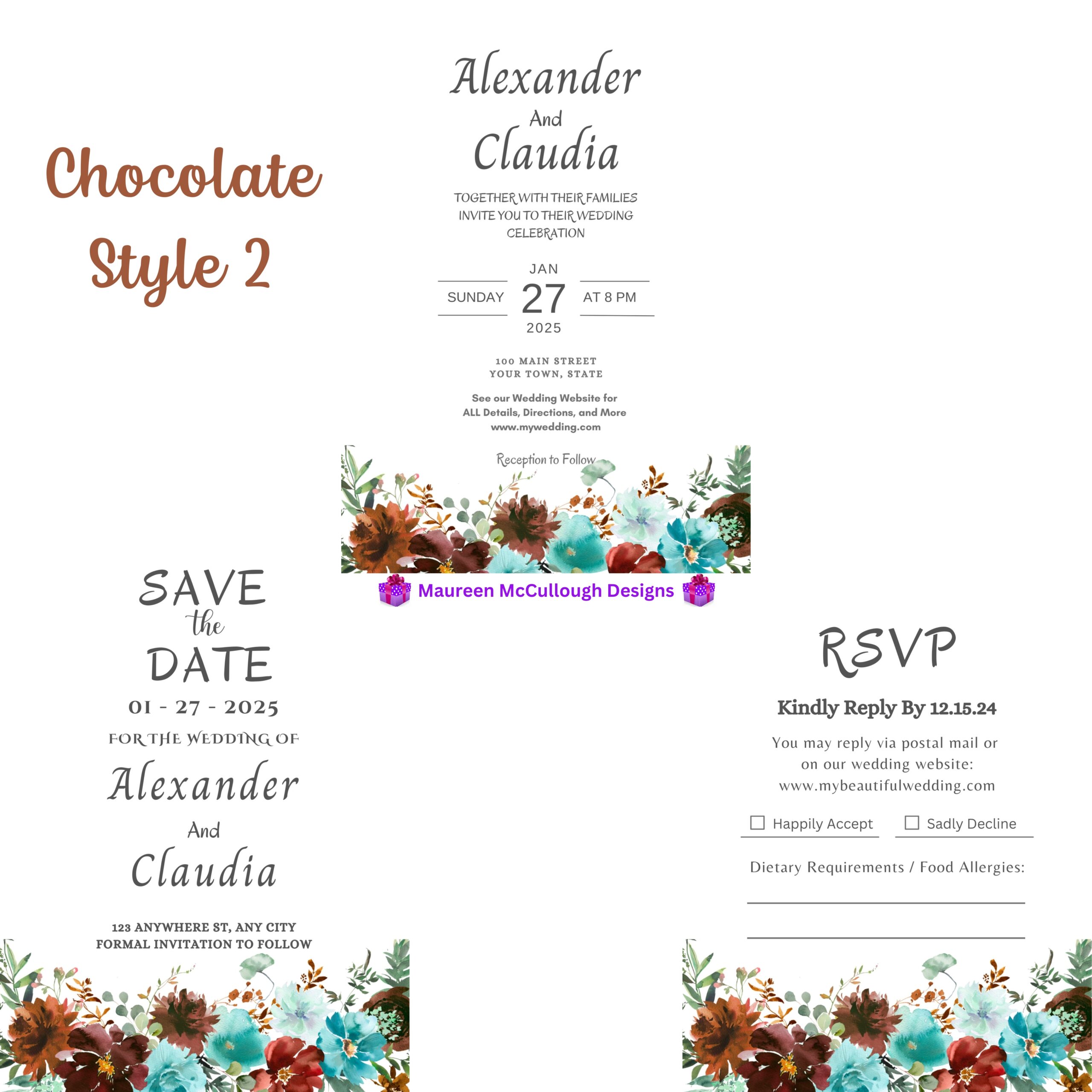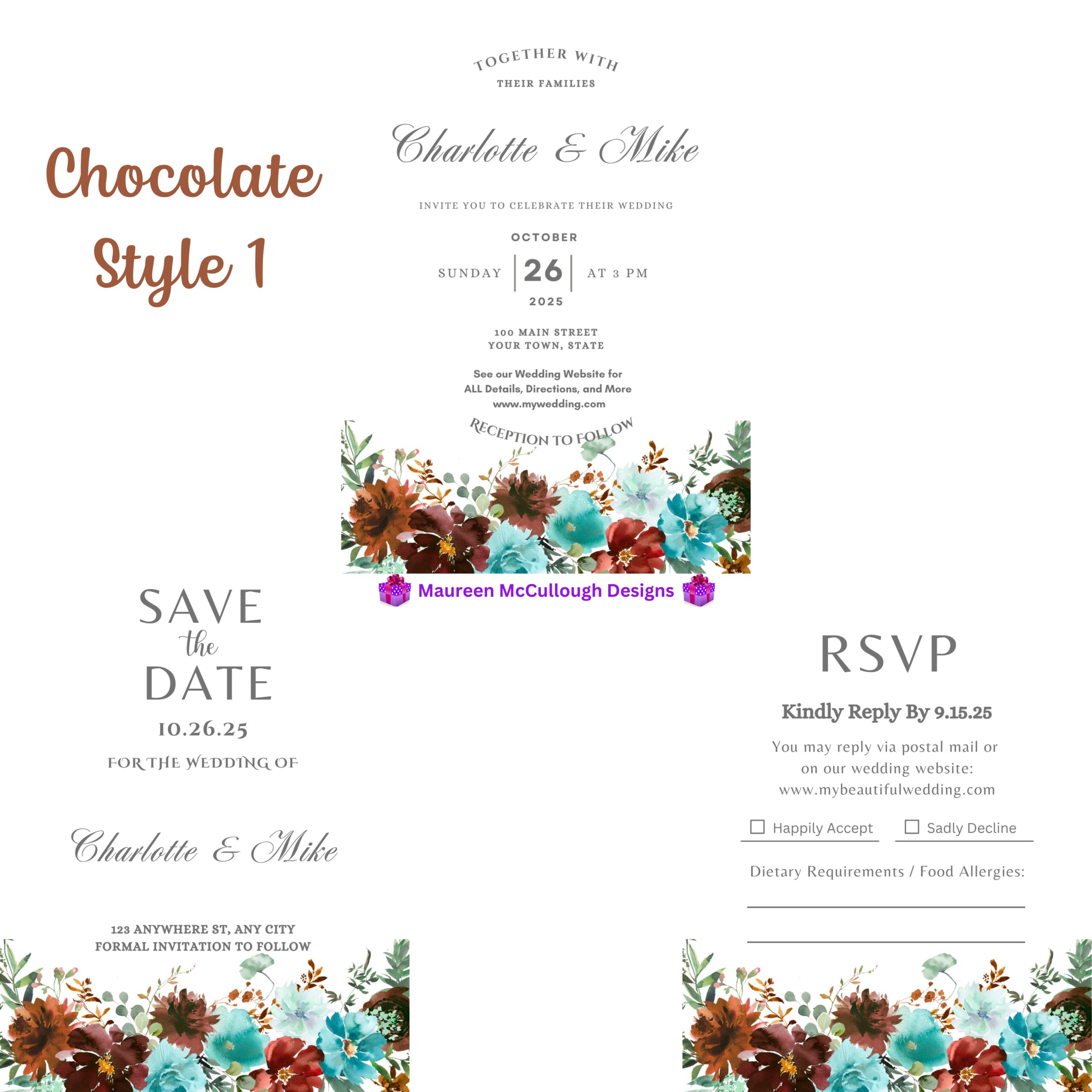 Chocolate is a warm, rustic-elegant wedding invitation suite designed for couples who love rich autumn tones and vintage-inspired charm. This made-to-order set includes your save the date, wedding invitation, and RSVP card, each personalized with your names, date, time, venue, and optional wedding website URL or alternate wording.
