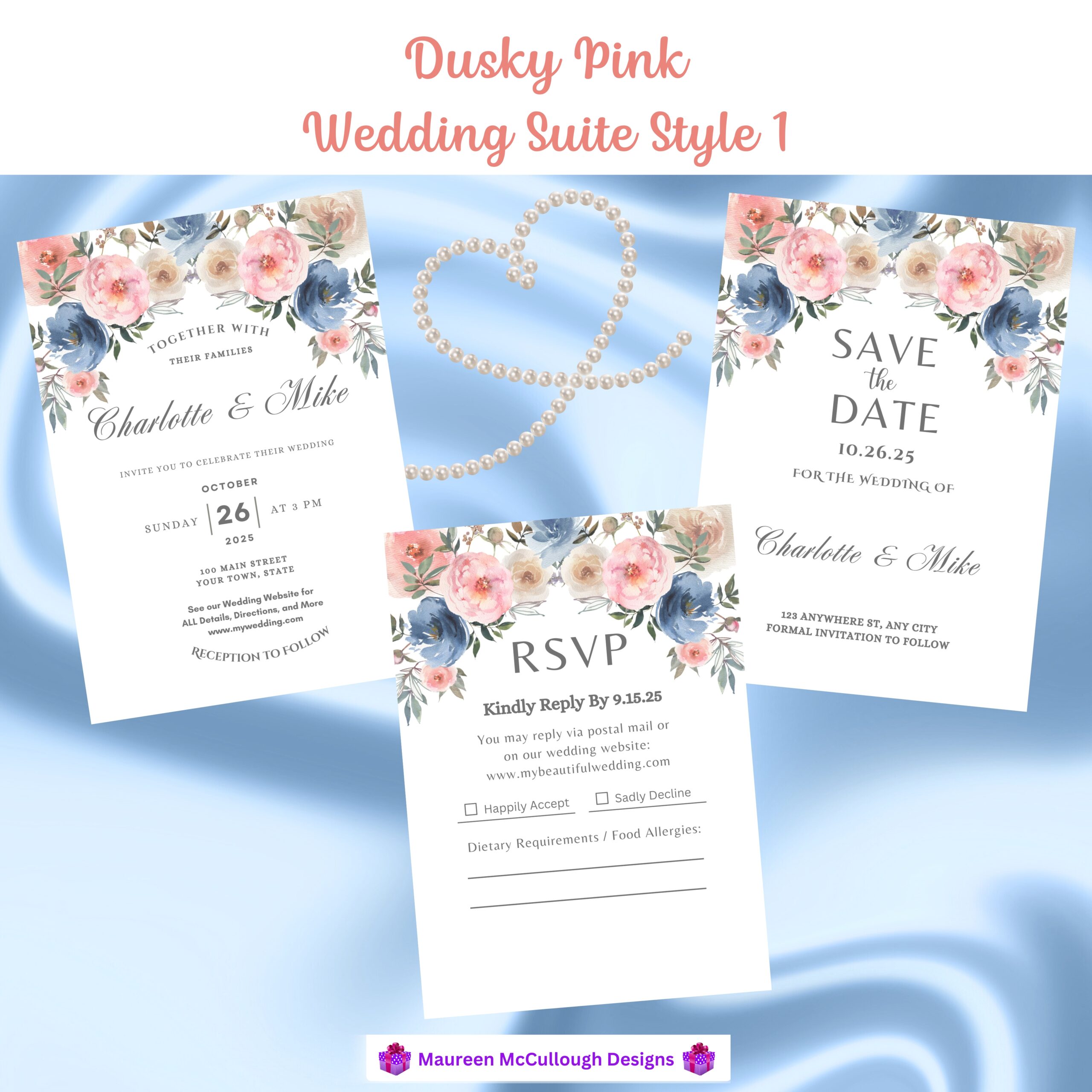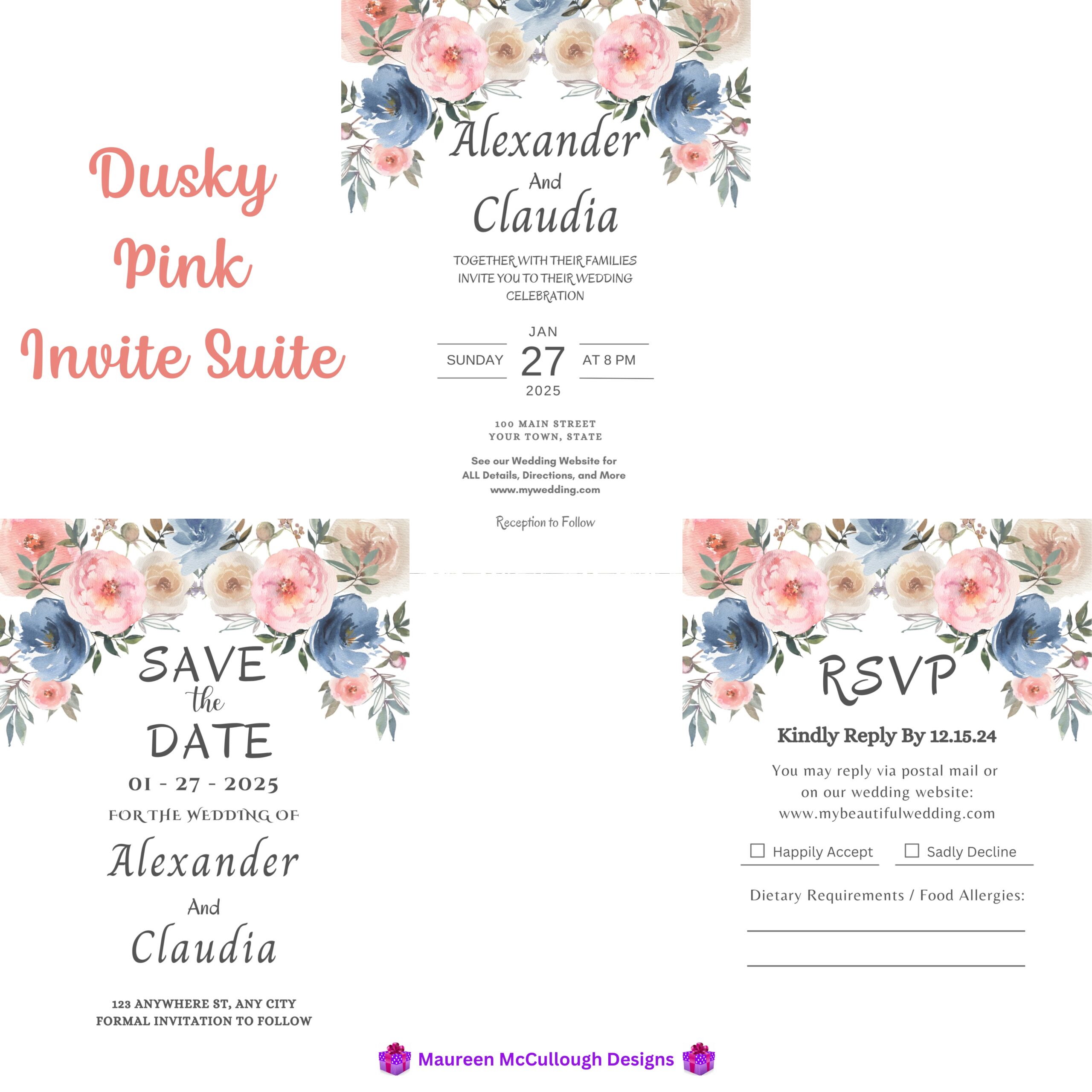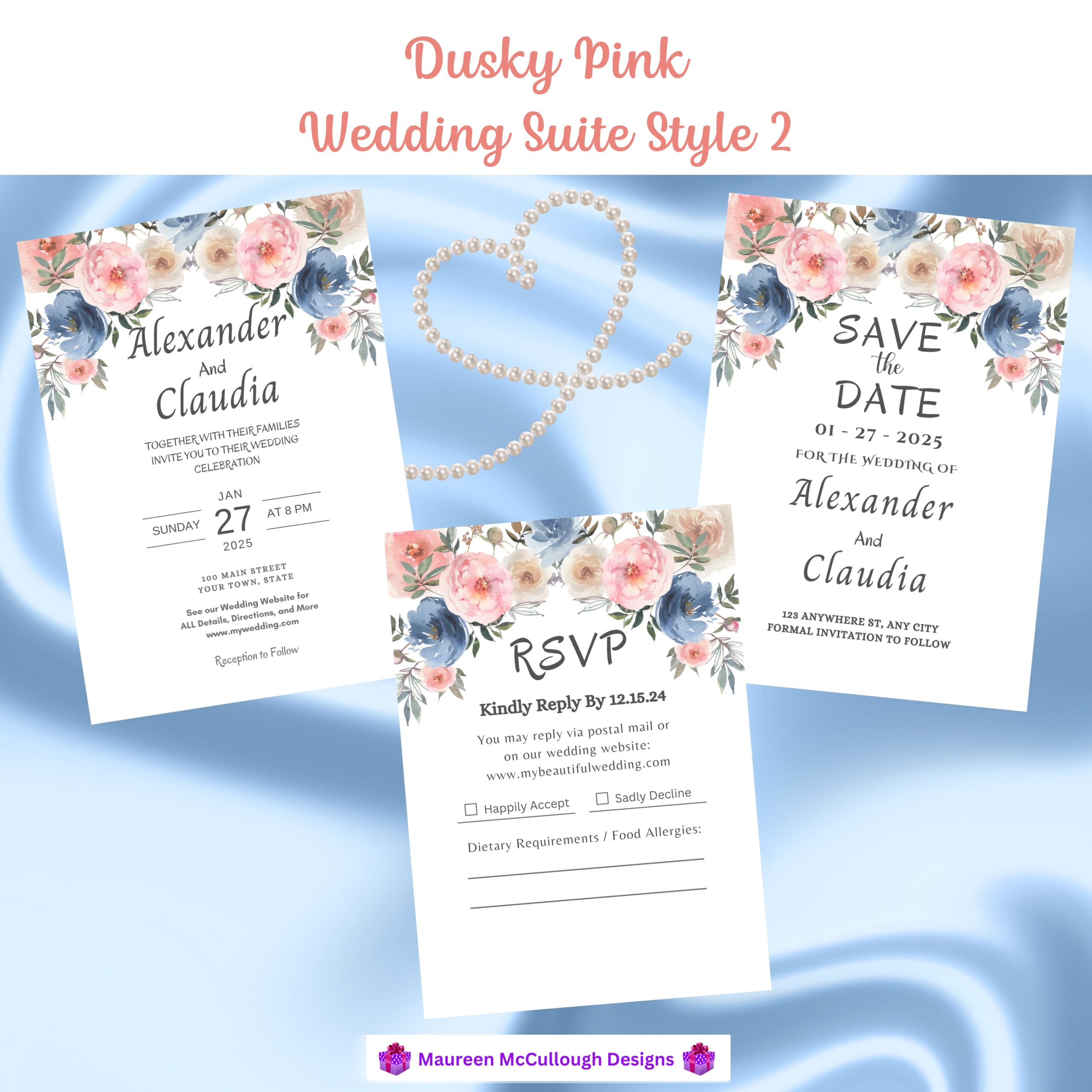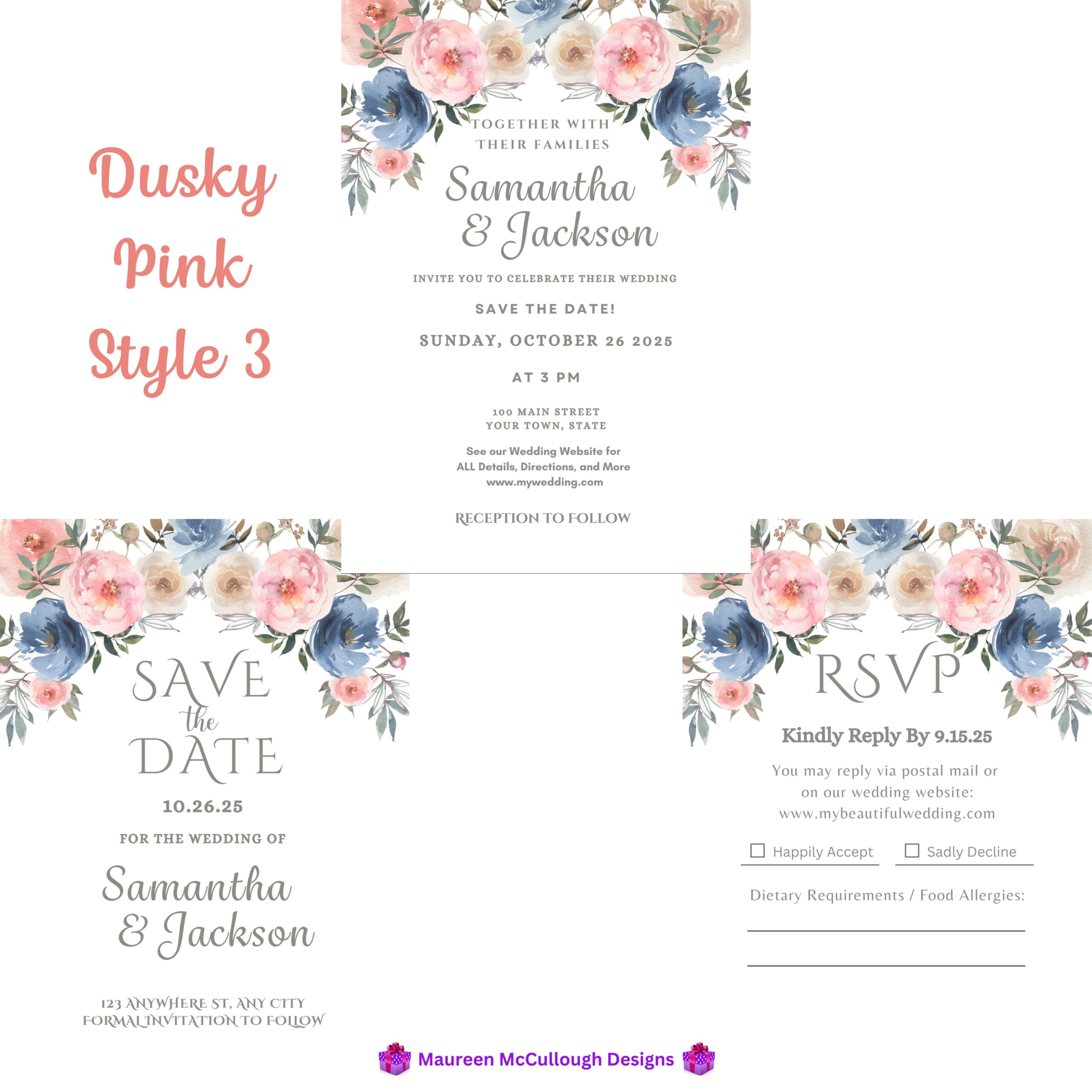 The palette features dusty pink, cream, deep blue, and sage green florals — a refined combination that brings pastel elegance and timeless warmth to your wedding aesthetic. Three signature script styles are available, allowing you to choose the look that best complements your event.
