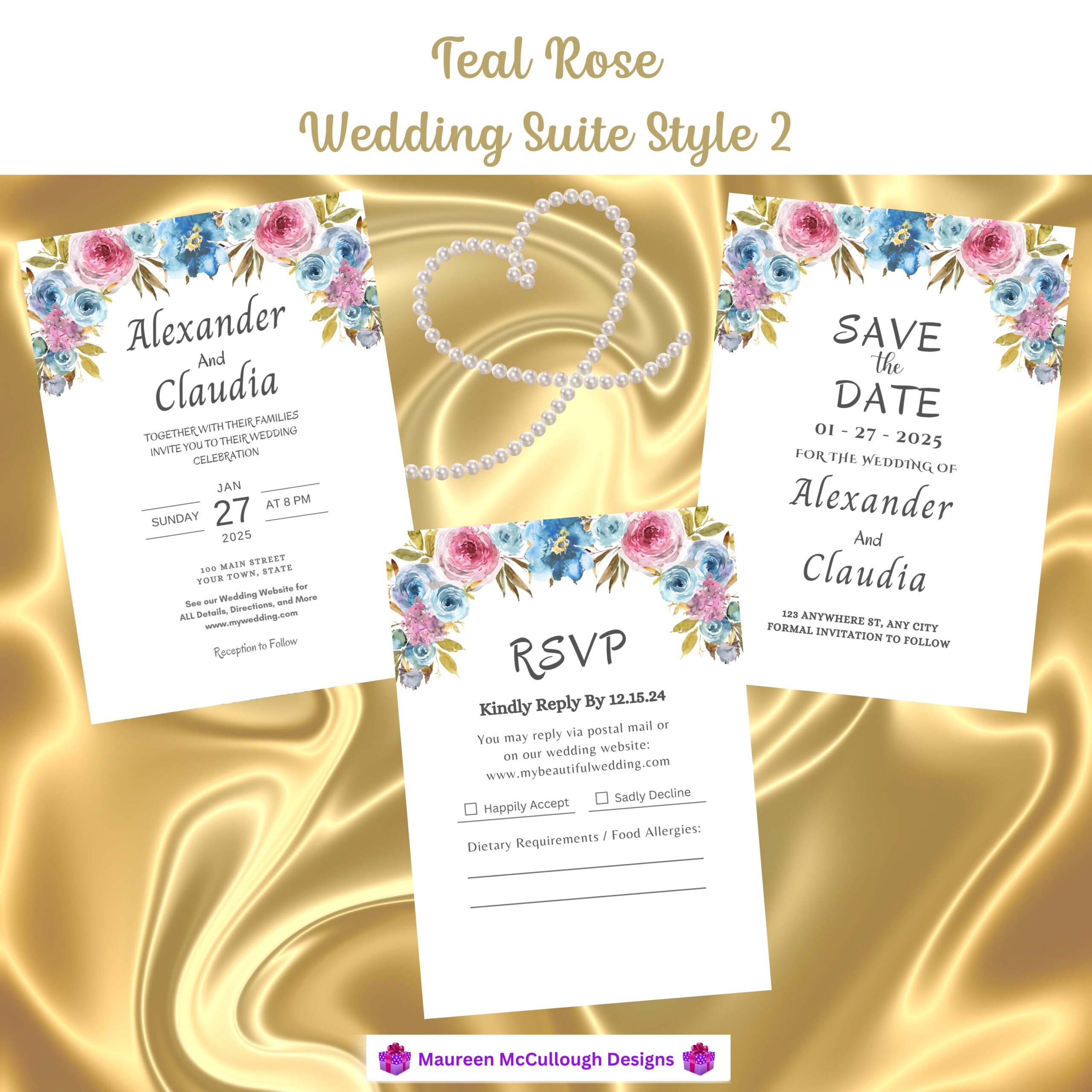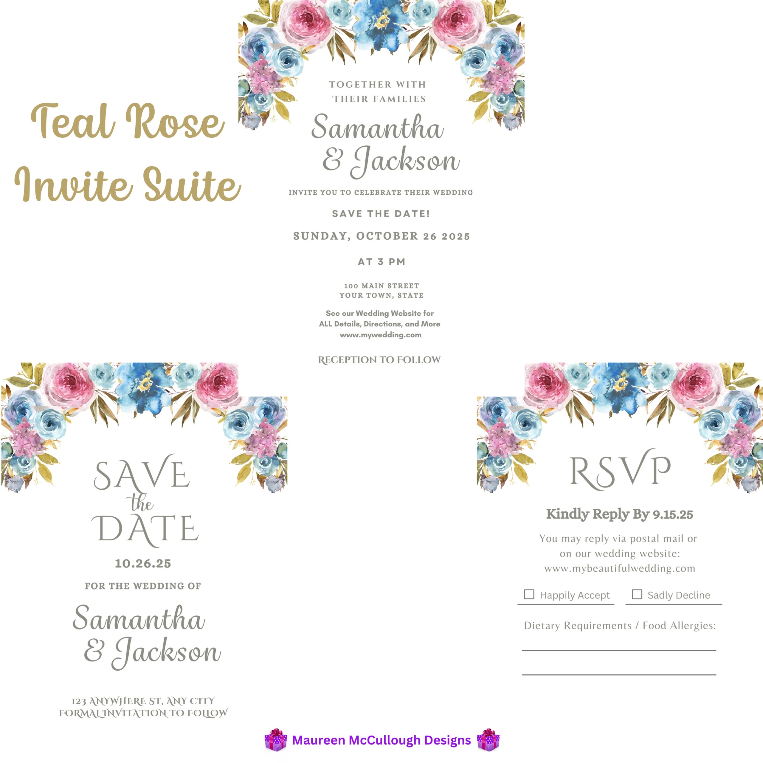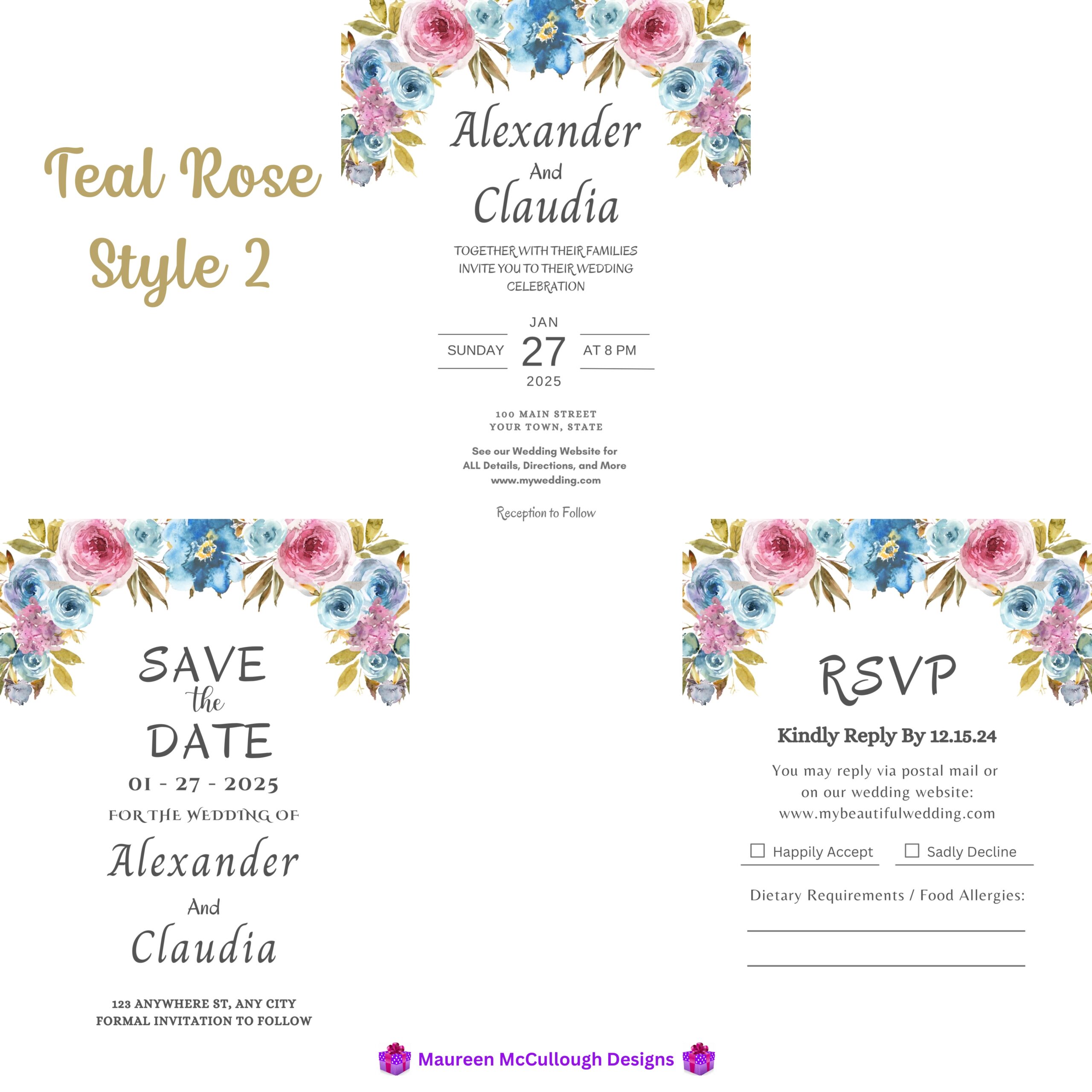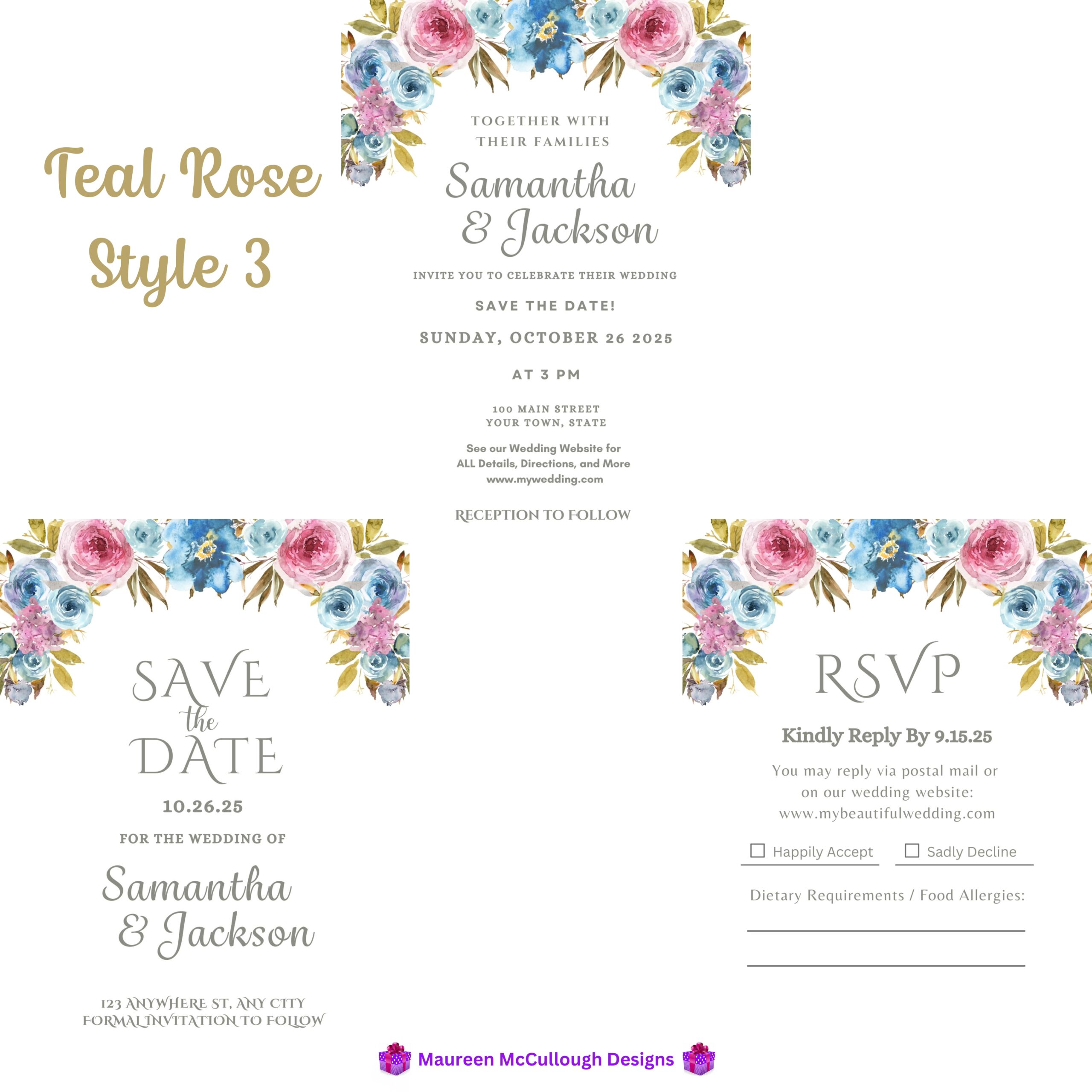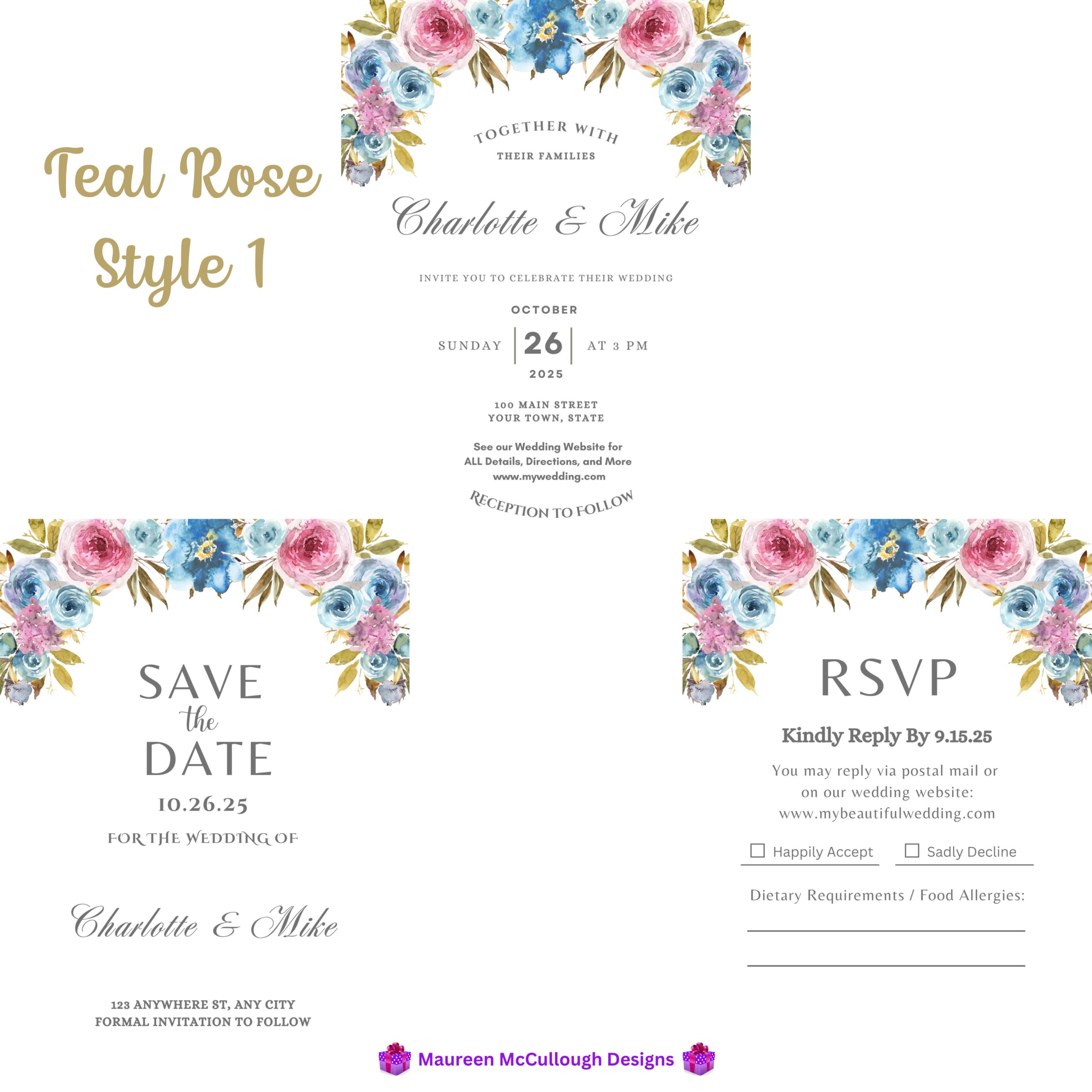Teal Rose is a light-hearted, airy, and romantic wedding invitation suite designed to bring a soft vintage charm to your celebration. This made-to-order collection includes your save the date, wedding invitation, and RSVP card, each personalized with your names, date, time, venue, and optional wedding website URL or alternate wording.